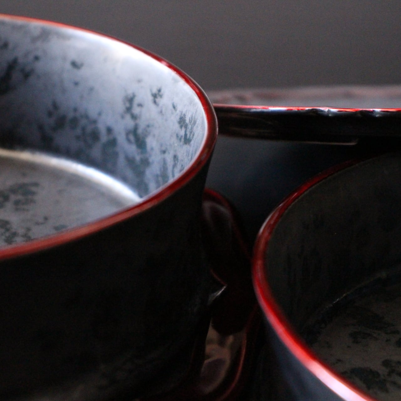 黒いまだらなマット調の釉薬の淵に、会津若松の塗りの作家「富樫孝男」さんに玉虫色の「漆」を付けて頂きました。何とも優雅な作品に仕上がりました。有田焼と塗りの初のコラボかも知れません。
