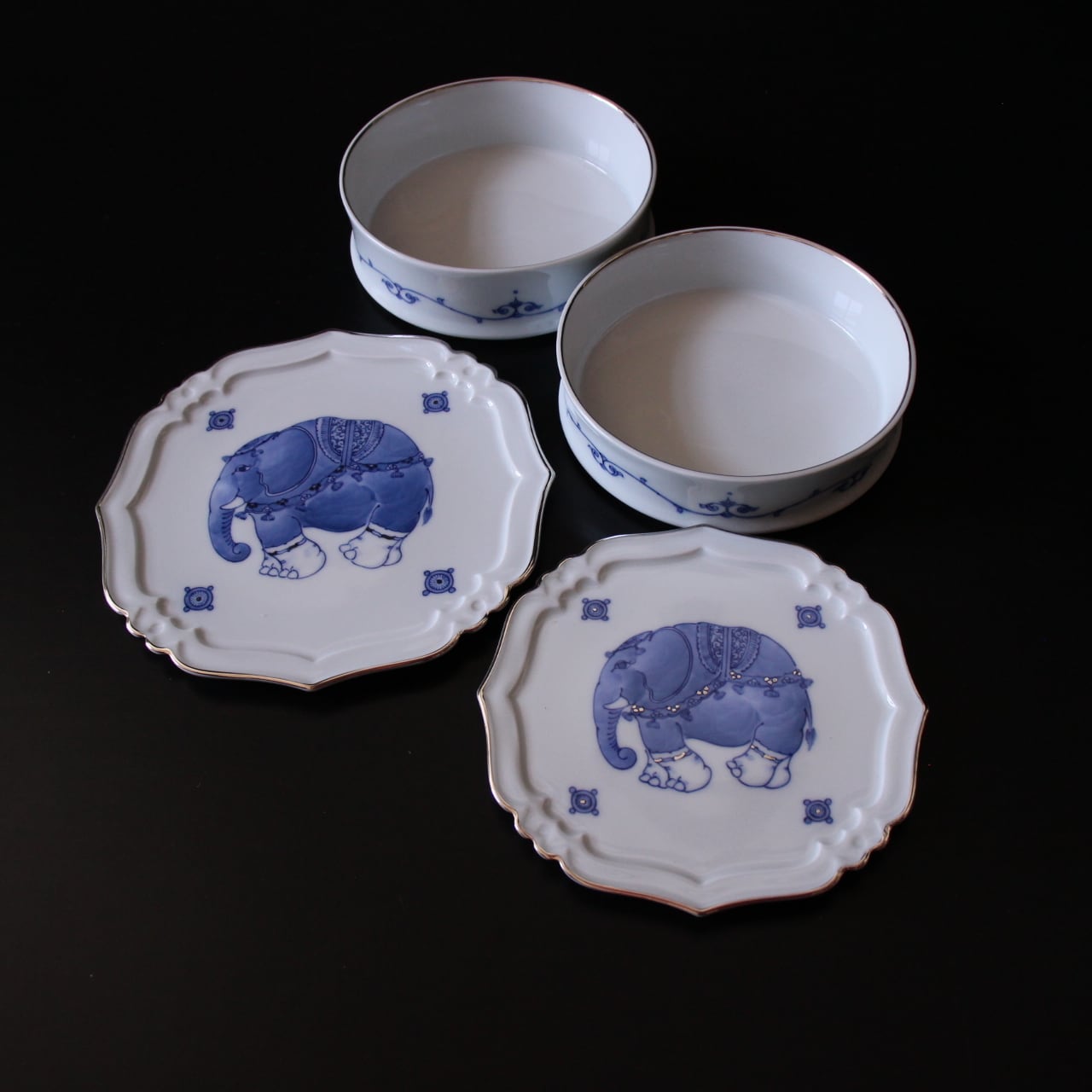 蓋、身が浅い、身が深い、台皿の4点セットです。