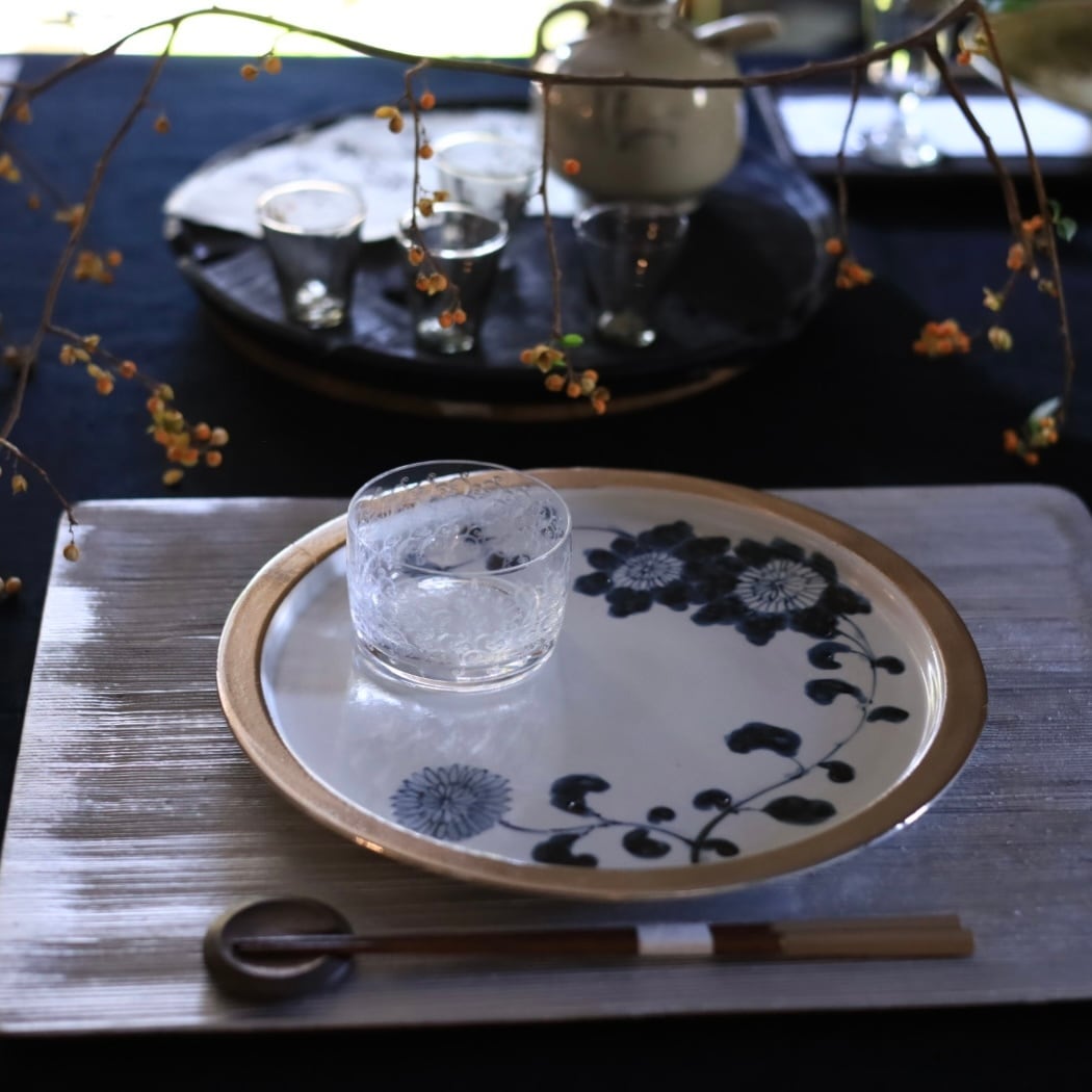 Φ27×h2cm 伊万里焼のプラチナのリムが美しい9寸皿です。 染付でのびやかに花が描かれた気品ある1枚。 余白がお料理をより一層引き立てます。