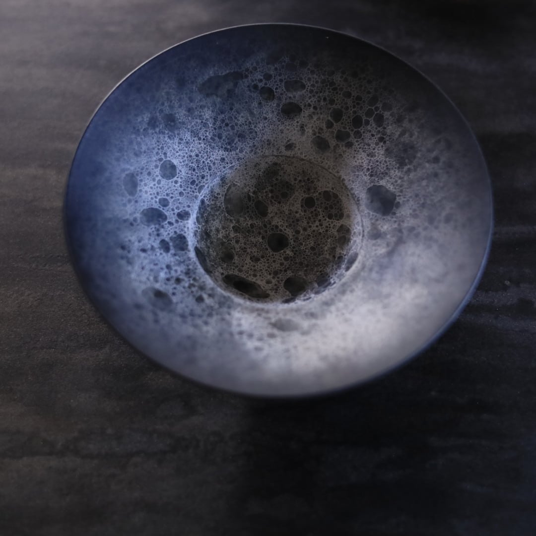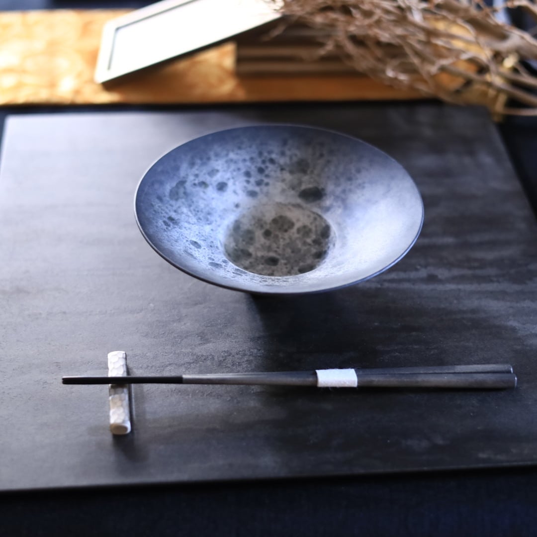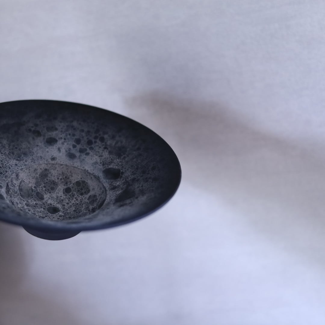 φ15.8㎝×h5.1㎝ ブラスト加工し、月面のような表情をしています。 マットな質感の肌触りすです。 焼き物の特徴上、1点ずつ柄の出方が異なります。