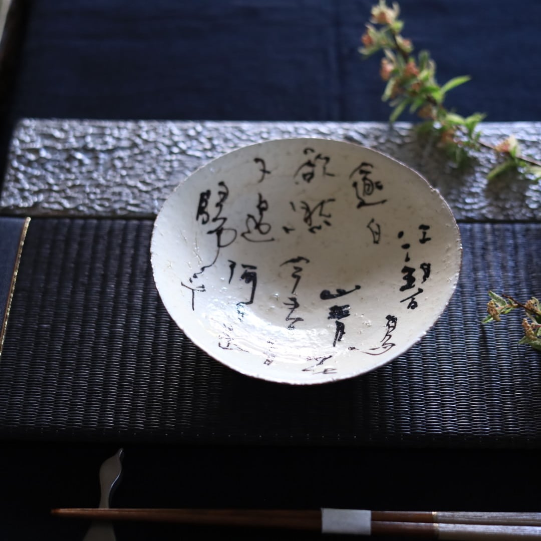 漢詩が書かれた皿です。 ■現代語訳 《川は碧く澄み、鳥はいっそう白く見え、 山は青く、花は燃えるように咲いている。 今年の春もまた過ぎていこうとしているが、 いったいいつになったら故郷へ帰れるのだろうか。》 色味や形状、釉薬のかかり具合等には個体差がございます。 焼き物の個性としてお楽しみ下さい。 【サイズ】約φ14.5cm 高さ3.3cm 食洗器 × 電子レンジ × オーブン ×