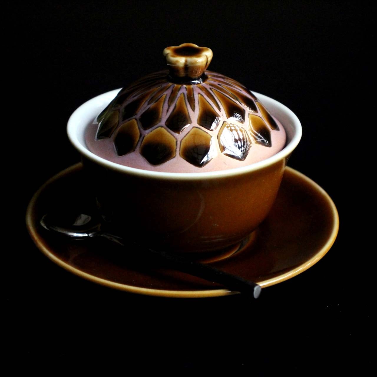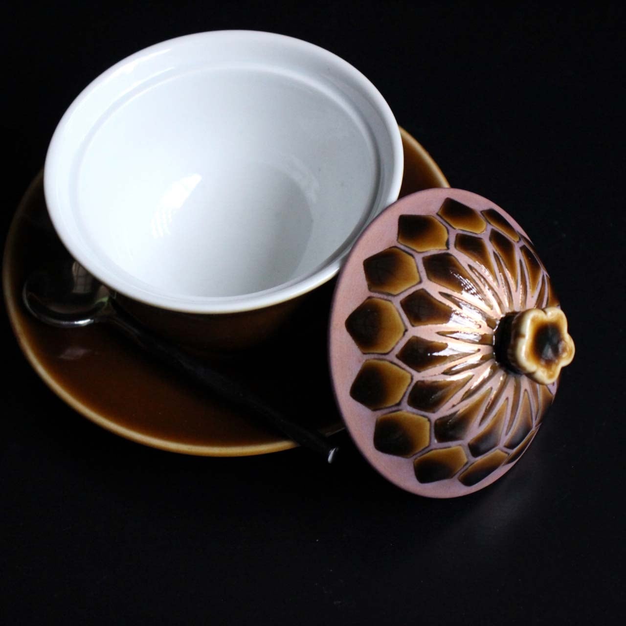 26402 飴釉ダイヤ紋 つまみミニ小蓋物(台皿付き)