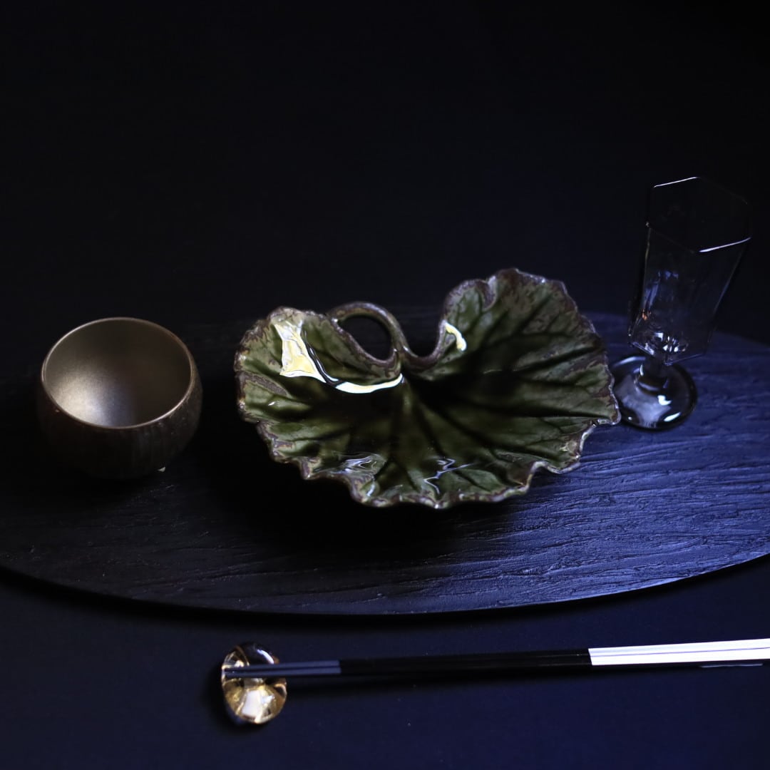 18×13.5×h5 黒っぽい織部で落ち着いたお色味です。 ツワの葉の葉脈がうっすらと見える上品な器。 料亭などで主に「お刺身」などに使われます。