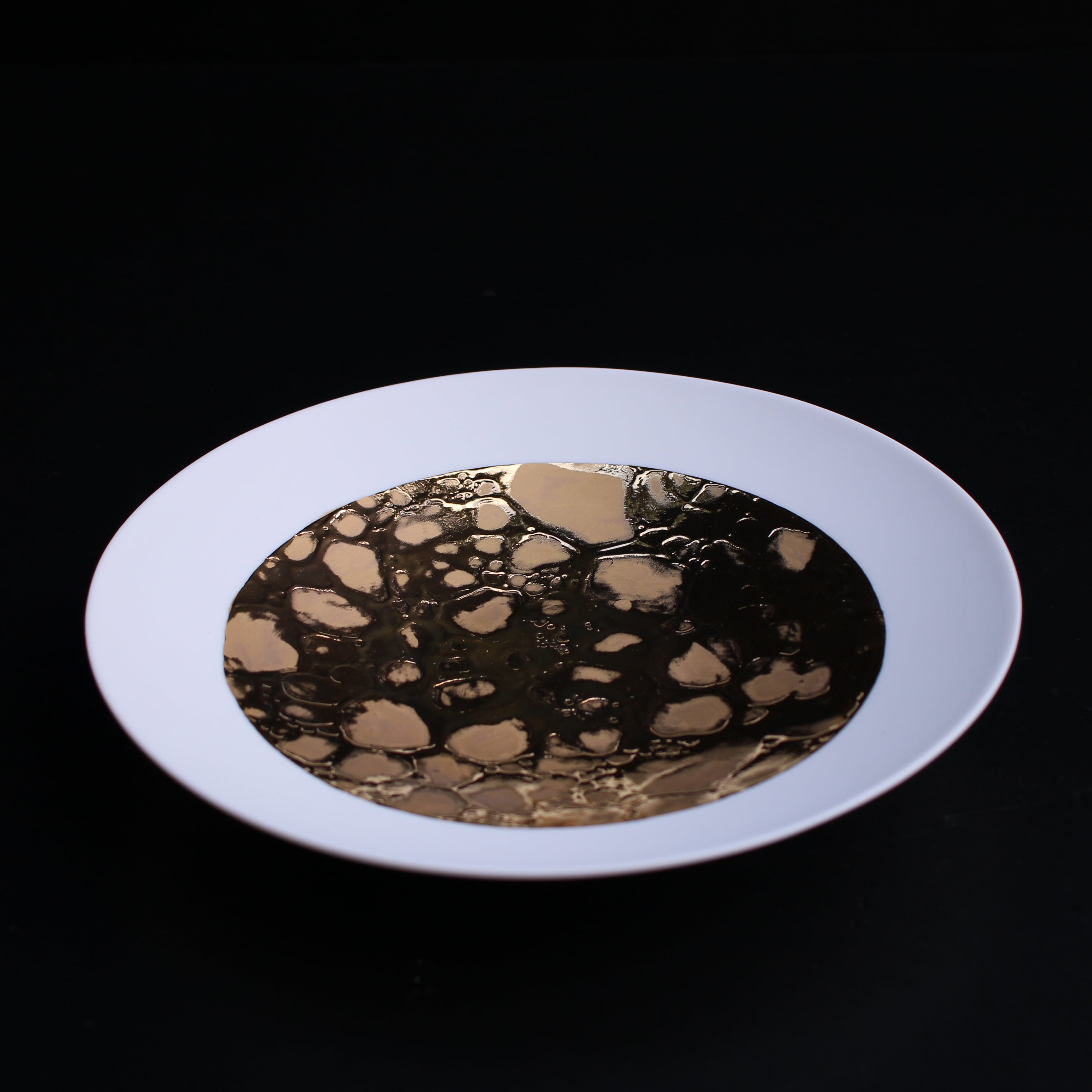 有田焼 やま平窯 サイズ:φ23.5㎝ h4㎝ 白いマットなリムが美しく、金の泡の釉薬を上品に引き立てます。 モダンにアレンジしたり、骨董と合わせても相性のいいお皿です。